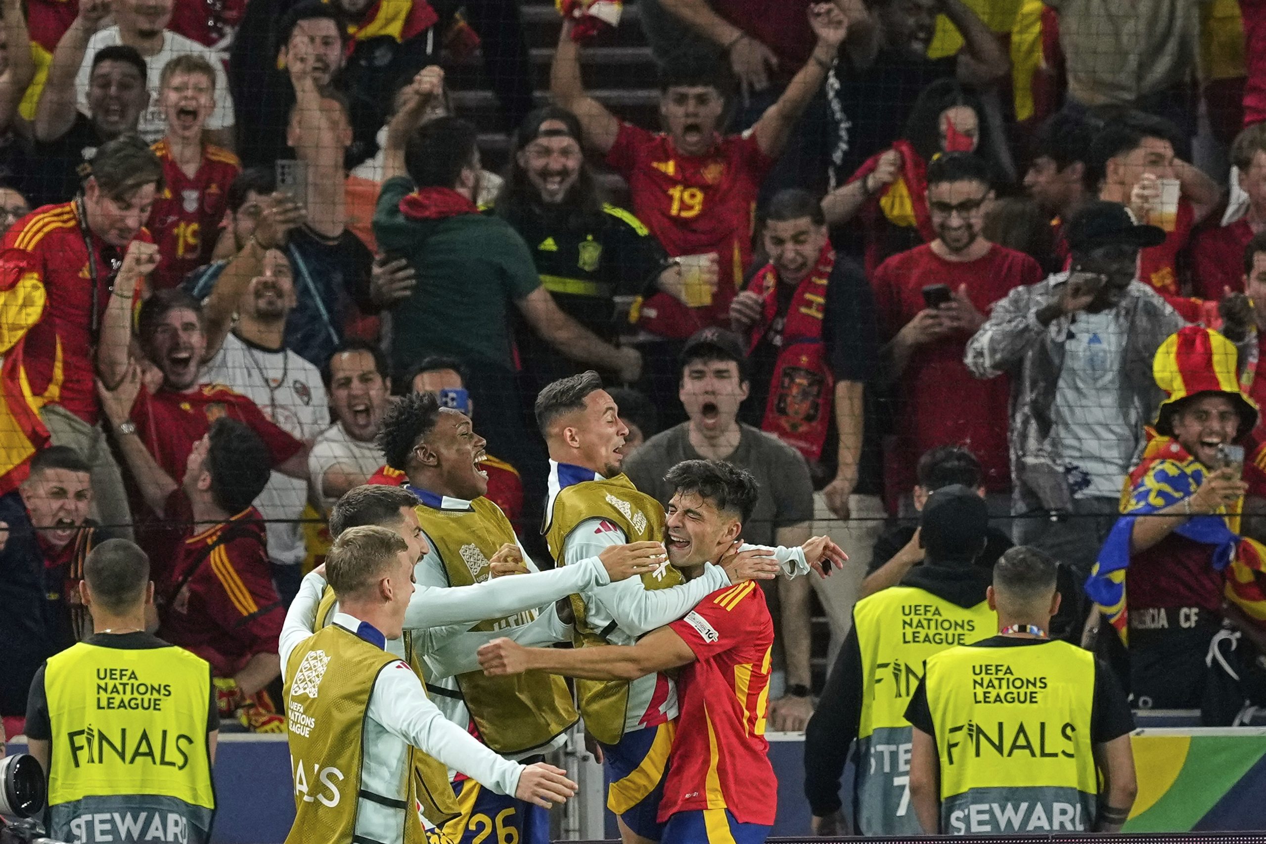 Spain's Pedri is celebrated by teammates after scoring his side's 4th goal against France during the Nations League semifinal soccer match between Spain and France at the MHPArena, in Stuttgart, Germany, Thursday, June 5, 2025. AP/PTI(AP06_06_2025_000128B)