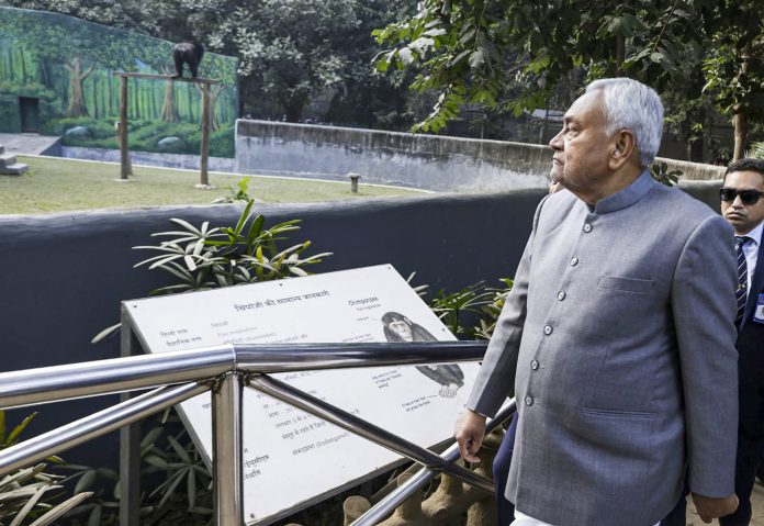 **EDS: THIRD PARTY IMAGE** In this image posted on Dec. 25, 2025, Bihar Chief Minister Nitish Kumar visits Sanjay Gandhi Biological Park, directs the immediate resumption of the toy train, and names a newborn zebra calf 'Samriddhi', in Patna. (@officecmbihar/X via PTI Photo)(PTI12_25_2025_000494B)