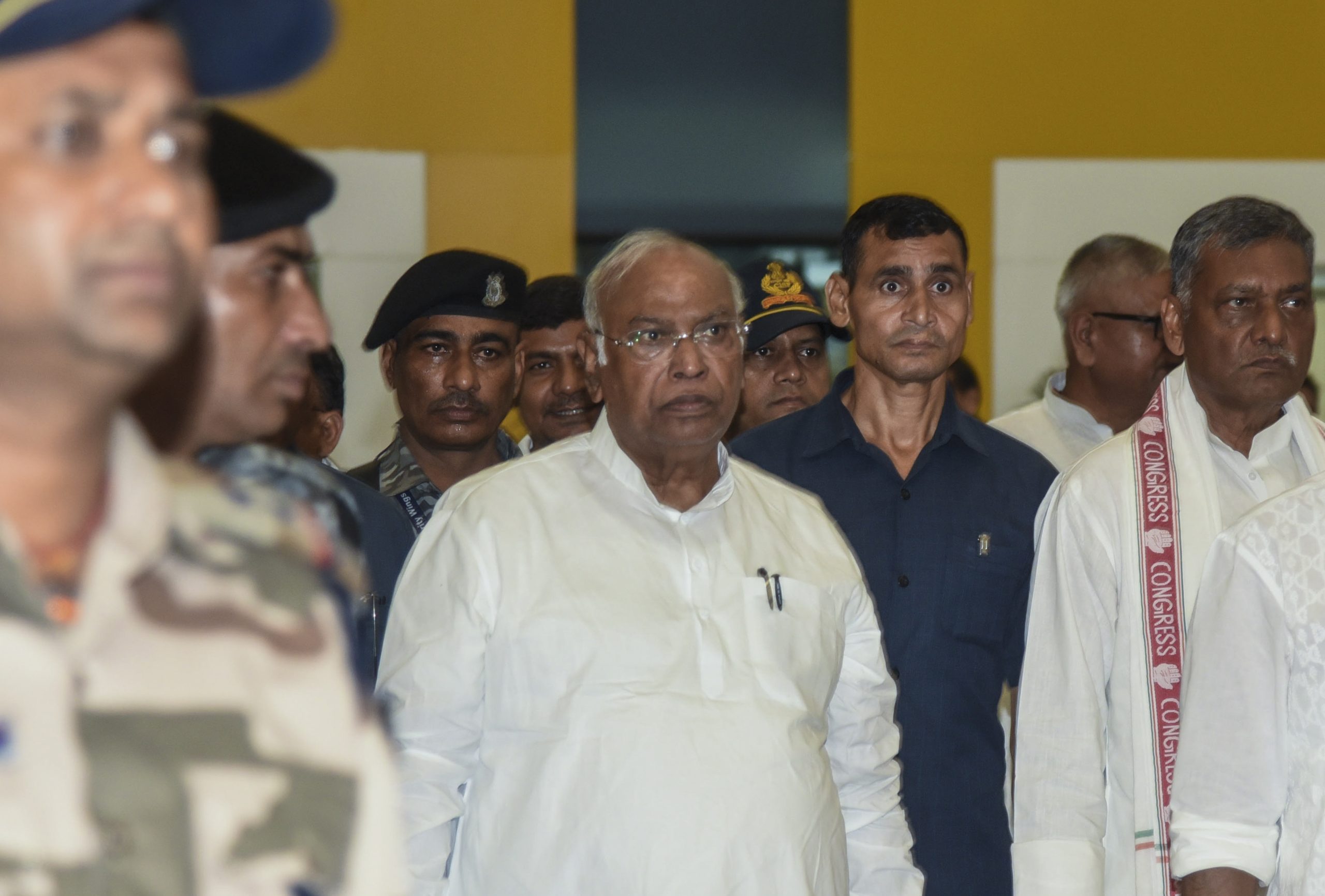 Patna: Congress President Mallikarjun Kharge arrives at Jay Prakash Narayan International Airport, in Patna, Sept. 23, 2025. (PTI Photo)(PTI09_23_2025_000391B)