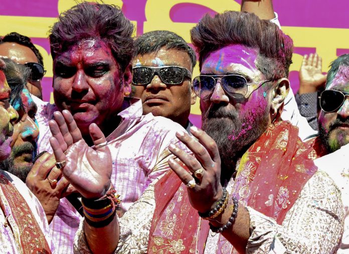 Patna: Union Minister and Lok Janshakti Party (Ram Vilas) chief Chirag Paswan with party workers during a Holi Milan function, in Patna, Monday, March 2, 2026. (PTI Photo)(PTI03_02_2026_000279B)