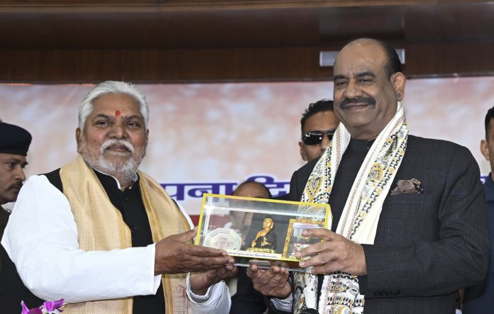 Patna: Lok Sabha Speaker Om Birla, right, being presented a memento by Bihar Assembly Speaker Prem Kumar during the foundation day celebration of the state Assembly, at Central Hall, in Patna, Saturday, Feb. 7, 2026. (PTI Photo) (PTI02_07_2026_000042B)