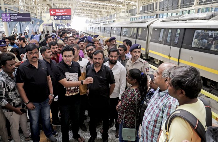 बेंगलुरुः भाजपा सांसद तेजस्वी सूर्या को सोमवार को शहर में किफायती सार्वजनिक परिवहन की मांग को लेकर जयानगर मेट्रो स्टेशन पर प्रदर्शन करने के लिए हिरासत में लिया गया, पुलिस ने कहा कि सूर्या, जो भारतीय जनता युवा मोर्चा (भाजयुमो) के राष्ट्रीय अध्यक्ष भी हैं, ने मेट्रो किराया वृद्धि के खिलाफ मेट्रो स्टेशन पर विरोध प्रदर्शन किया, जिसे दूरी के आधार पर एक रुपये से बढ़ाकर पांच रुपये कर दिया गया है।