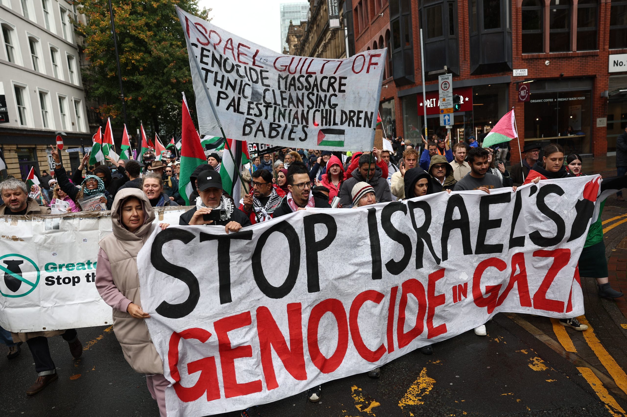 People take part in a demonstration organized by GM Friends of Palestine at Manchester Cathedral, in Manchester, England, Saturday, Oct. 4 2025. AP/PTI(AP10_04_2025_000264B)