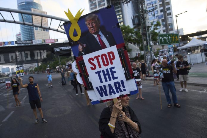 Relatives of hostages held by Hamas in the Gaza Strip and their supporters call for an immediate hostage release deal during a protest in Tel Aviv, Israel, Thursday, July 10, 2025. (AP/PTI Photo)(AP07_10_2025_000519B)