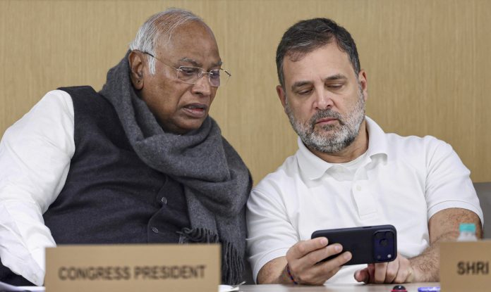 **EDS: THIRD PARTY IMAGE** In this image received on Dec. 27, 2025, Congress President Mallikarjun Kharge, left, with LoP in the Lok Sabha and party leader Rahul Gandhi during the Congress Working Committee (CWC) meeting, in New Delhi. (AICC via PTI Photo)(PTI12_27_2025_000148B)