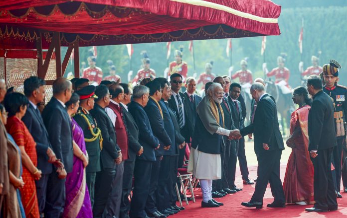 नई दिल्ली, 5 दिसम्बर (PTI) रूस-यूक्रेन संघर्ष के मुद्दे पर भारत निष्पक्ष नहीं है, बल्कि शांति के पक्ष में है — प्रधानमंत्री नरेंद्र मोदी ने यह बात शुक्रवार को यहां आयोजित वार्षिक शिखर वार्ता के दौरान रूसी राष्ट्रपति व्लादिमीर पुतिन को स्पष्ट रूप से बताई।
