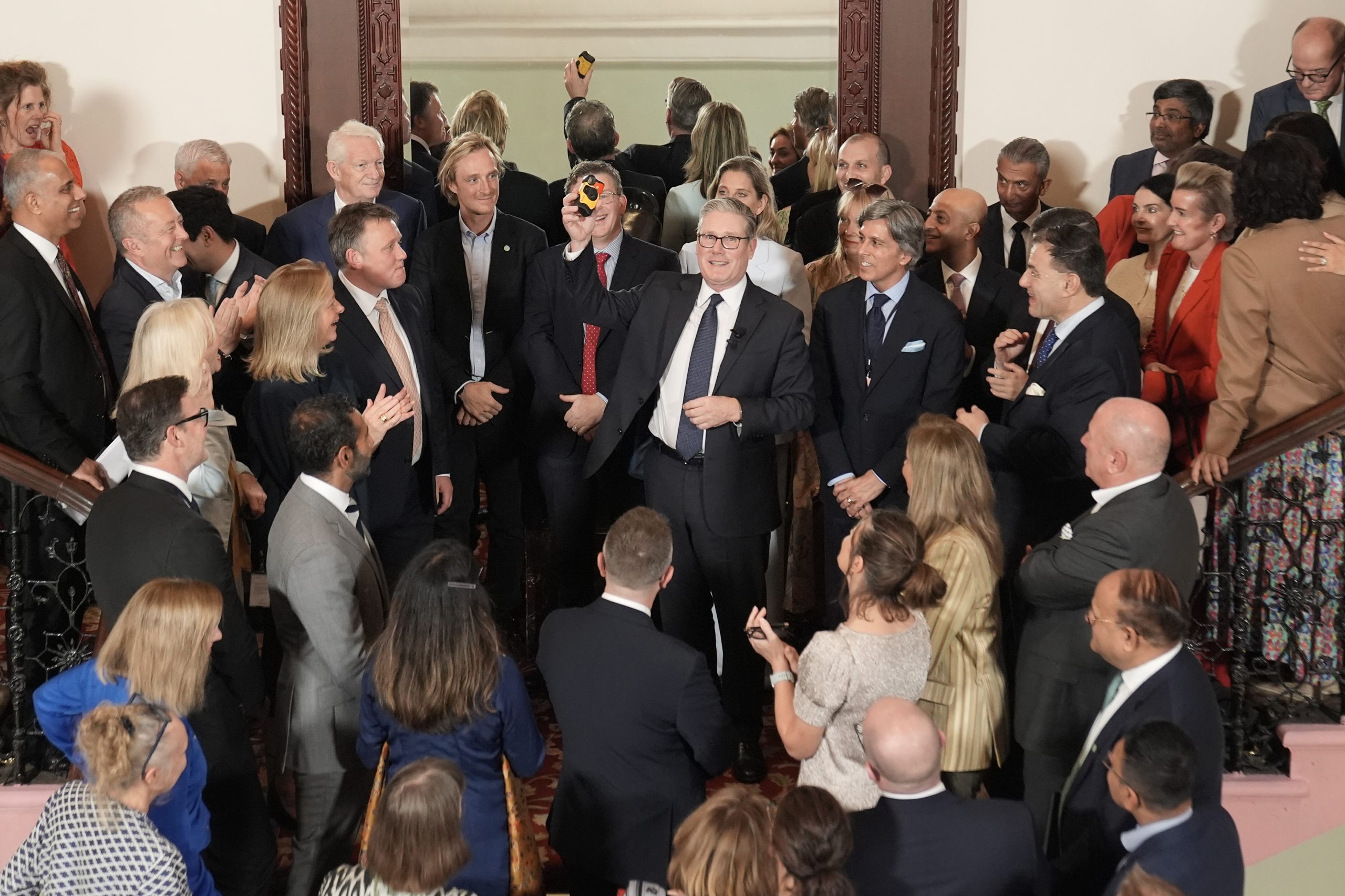Britain's Prime Minister Keir Starmer, center, takes a picture while speaking to the travelling delegation of business and cultural leaders who joined him on the trip during his visit to India Wednesday, Oct. 8, 2025. AP/PTI(AP10_08_2025_000088B)