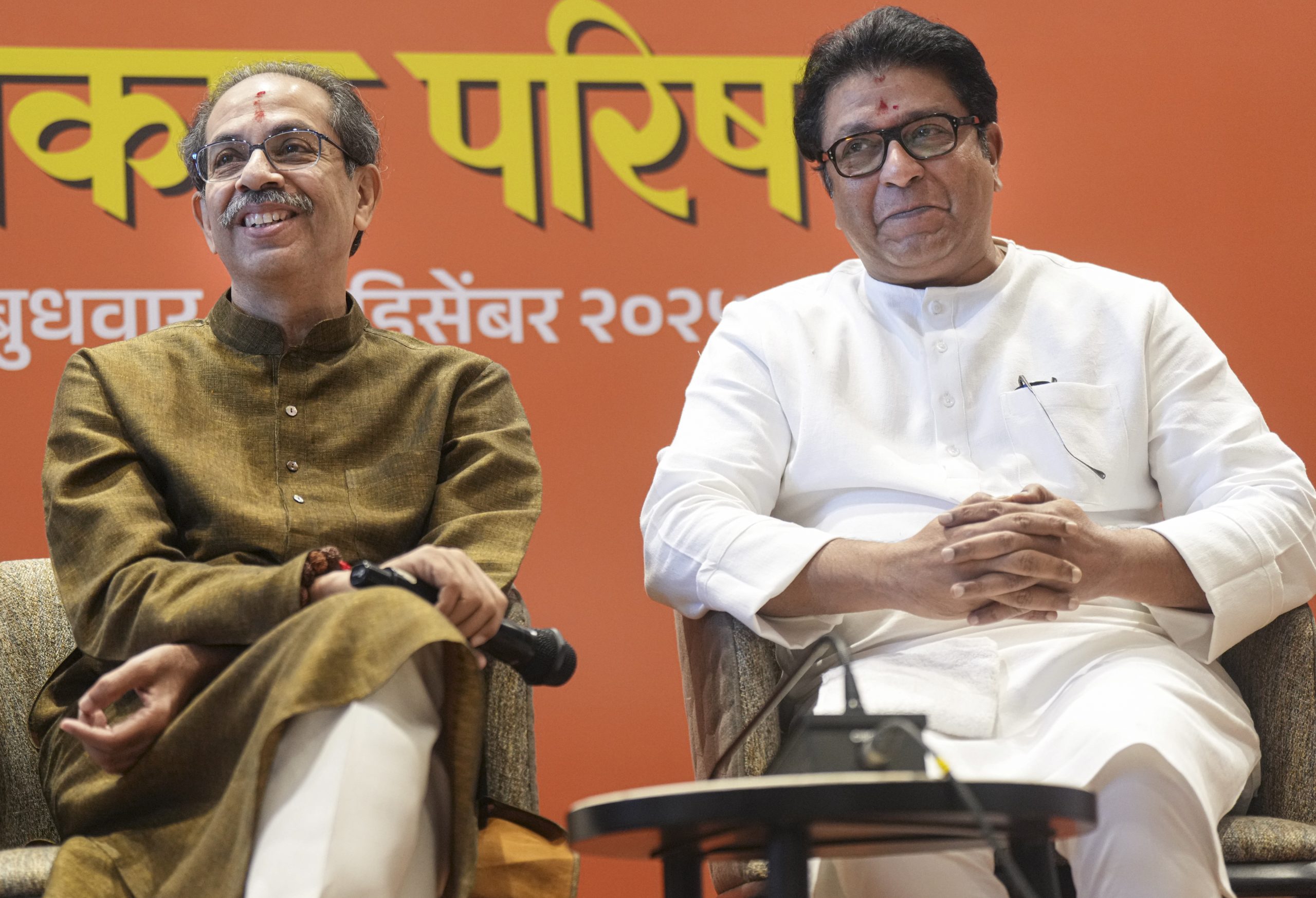 Mumbai: Shiv Sena (UBT) chief Uddhav Thackeray, left, and Maharashtra Navnirman Sena (MNS) chief Raj Thackeray during a joint press conference announcing an alliance between their parties ahead of the Brihanmumbai Municipal Corporation (BMC) elections, in Mumbai, Wednesday, Dec. 24, 2025. (PTI Photo/Shashank Parade)(PTI12_24_2025_000153B)