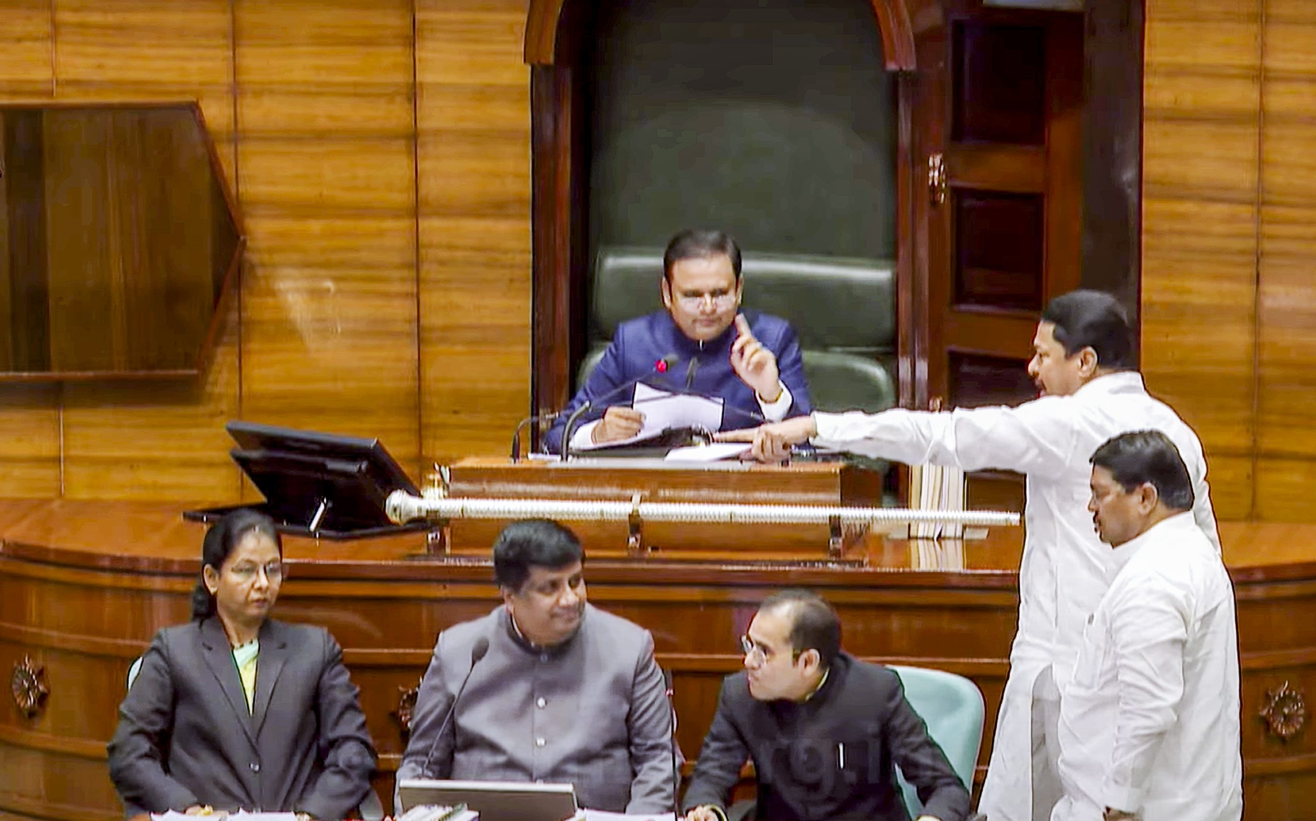 **EDS: THIRD PARTY IMAGE** In this screenshot via @MlsComputerAssembly on Youtube, Maharashtra Assembly Speaker Rahul Narwekar and Congress MLA Nana Patole during the Monsoon session of the State Assembly, at Vidhan Bhavan, in Mumbai, Tuesday, July 1, 2025. Patole was suspended from the Assembly for a day on Tuesday after he climbed the speaker's podium, demanding action against BJP MLA Babanrao Lonikar and Agriculture Minister Manikrao Kokate for allegedly insulting farmers.(Youtube/MlsComputerAssembly via PTI Photo)(PTI07_01_2025_000282B)