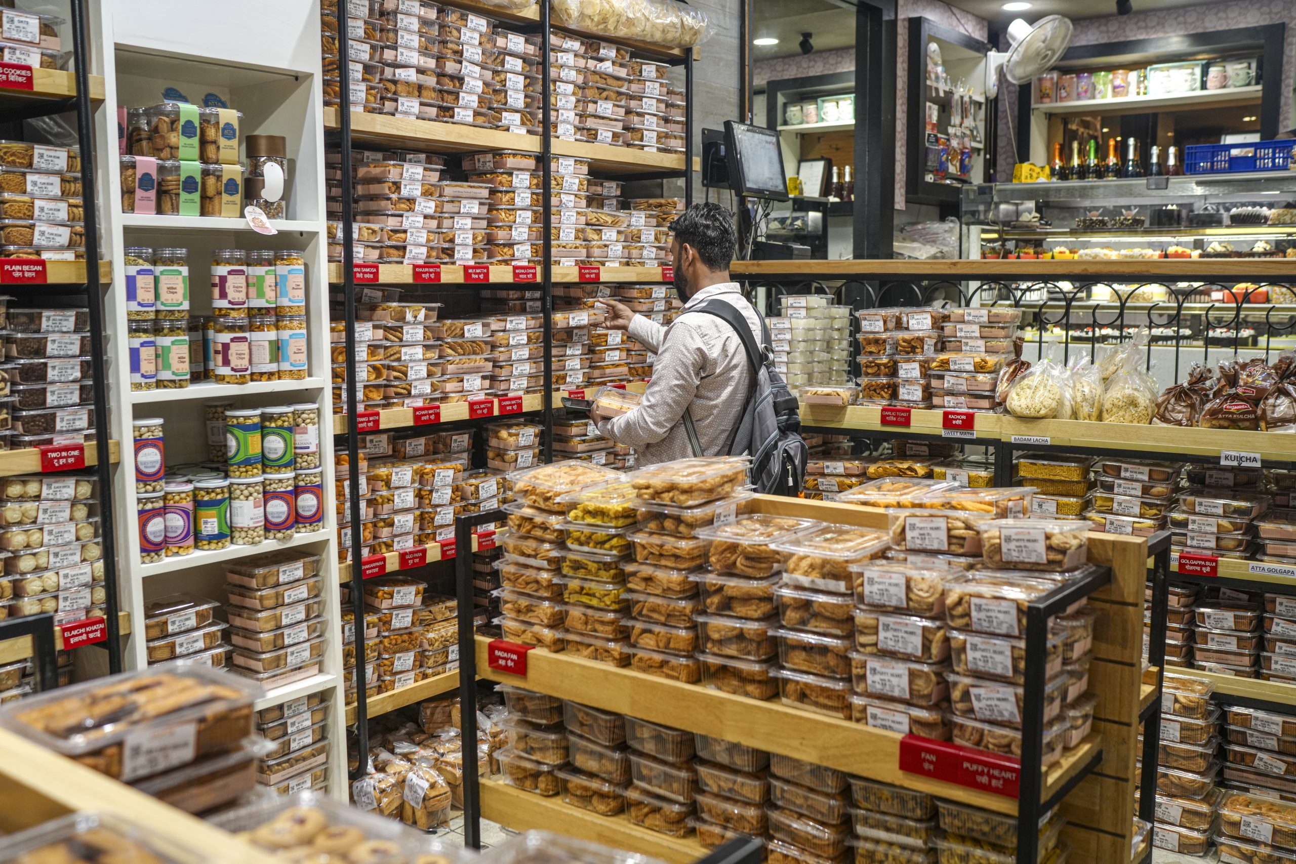 New Delhi: A customer checks food items at a bakery, in New Delhi, Thursday, Sept. 4, 2025. The GST Council on Wednesday approved overhauling the Goods and Services Tax (GST) effective September 22, making it a two slab structure of 5 and 18 per cent and a 40 per cent rate on sin and ultra luxury items. (PTI Photo/Karma Bhutia)(PTI09_04_2025_000306B)
