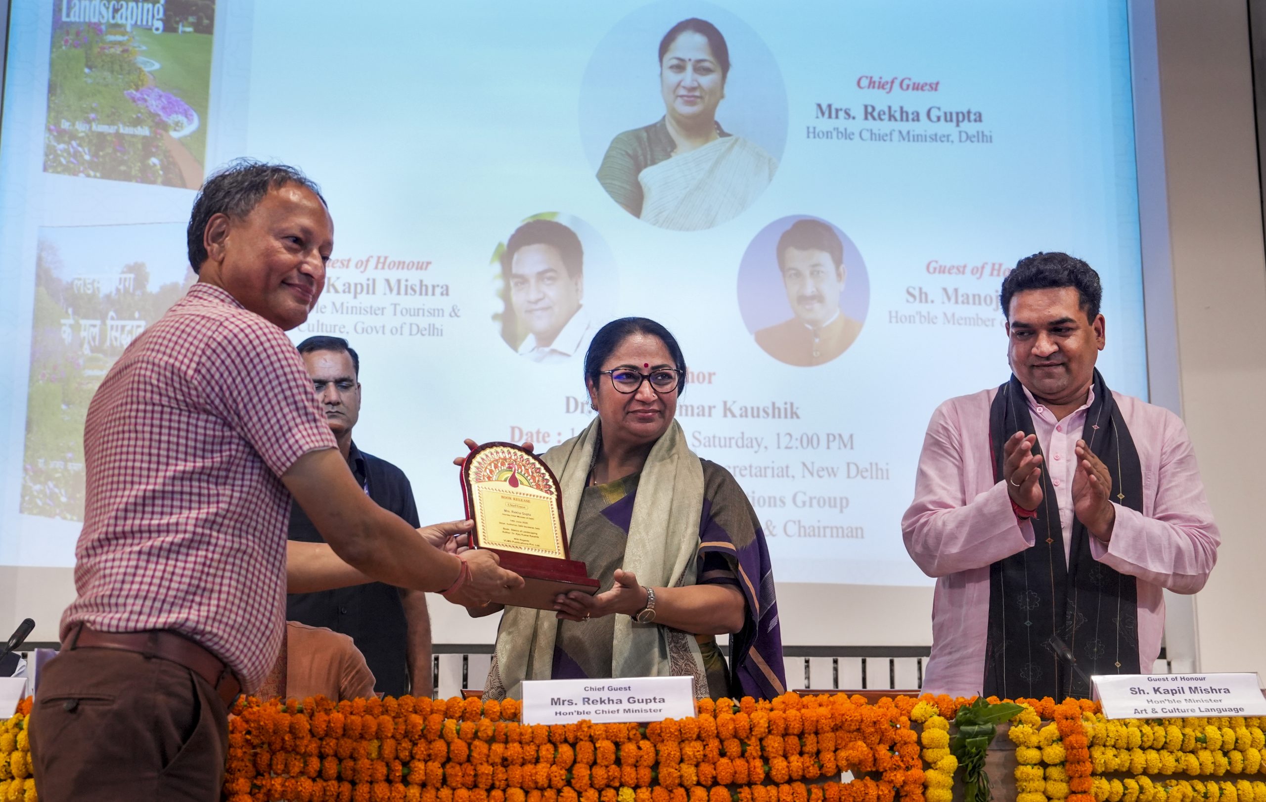 New Delhi: Delhi Chief Minister Rekha Gupta being presented a memento by author Ajay Kumar Kaushik, Deputy Director (Horticulture), Delhi Tourism, as Delhi minister Kapil Mishra applauds during the launch of Kaushik's book 'Basics of Landscaping', in New Delhi, Saturday, June 14, 2025. (PTI Photo/Manvender Vashist Lav)(PTI06_14_2025_000162B)