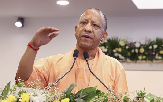 Prayagraj: Uttar Pradesh Chief Minister Yogi Adityanath and others addresses the gathering during the inauguration of advocate chambers and multi-level parking at the Allahabad High Court, in Prayagraj, Uttar Pradesh, Saturday, May 31, 2025. (PTI Photo) (PTI05_31_2025_000200B)
