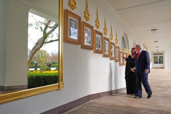 President Donald Trump and Saudi Arabia's Crown Prince Mohammed bin Salman walk along the Colonnade at the White House, Tuesday, Nov. 18, 2025, in Washington. AP/PTI(AP11_18_2025_000647B)