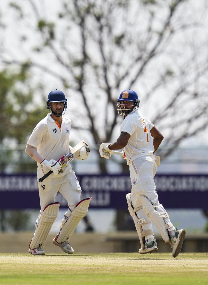 जम्मू और कश्मीर पहली पारीः 584 कर्नाटक पहली पारी पारीः केएल राहुल सी वधावन बी औकिब नबी 13 मयंक अग्रवाल एलबीडब्ल्यू बी औकिब नबी 160 देवदत्त पडिक्कल सी अब्दुल समद बी कुमार 11 करुण नायर बी औकिब नबी 0 रविचंद्रन स्मरण सी वधावन बी औकिब नबी 0 श्रेयस गोपाल lbw b युद्धवीर सिंह 27 कृतिक कृष्ण एलबीडब्ल्यू बी साहिल लोत्रा 36 विद्याधर पाटिल सी सब बी कुमार 11 विजयकुमार वैशाख नॉट आउट 17 शिखर शेट्टी एलबीडब्ल्यू बी औकिब नबी 0 प्रसिद्ध कृष्ण सी कुमार बी युद्धवीर सिंह 4 अतिरिक्तः (एलबी-3 एनबी-11) 14 कुलः (93.3 ओवर में ऑल आउट) 293 विकेट पतनः 1/27.2/56 3/57.4/57.5/162 6/241 7/256 8/278 9/288.10/293 गेंदबाजीः औकिब नबी 23-7-54-5, सुनील कुमार 19-6-51-2, युद्धवीर सिंह 14.3-3-55-2, आबिद मुश्ताक 23-2-75-0, साहिल लोत्रा 12-1-50-1, अब्दुल समद 2-0-5-0। जम्मू और कश्मीर दूसरी पारीः कामरान इकबाल नाबाद 94 यावेर हसन बी प्रसिद्ध कृष्णा 1 शुभम पुंडीर सी सब बी वैशाख 4 पारस डोगरा बी प्रसिद्ध कृष्णा 16 अब्दुल समद सी विशाल बी गोपाल 32 साहिल लोत्रा नाबाद 16 अतिरिक्तः (बी-17 एलबी-4 डब्ल्यू-2) 23 कुलः (57 ओवर में चार विकेट के लिए) 186 विकेट पतनः 1/6.2/11.3/72.4/145 गेंदबाजीः विजयकुमार वैशाख 10-1-30-1, प्रसिद्ध कृष्णा 12-0-42-2, विद्याधर पाटिल 9-0-39-0, शिखर शेट्टी 10-3-27-0, श्रेयस गोपाल 16-6-27-1. पीटीआई पीडीएस पीडीएस पीडीएस