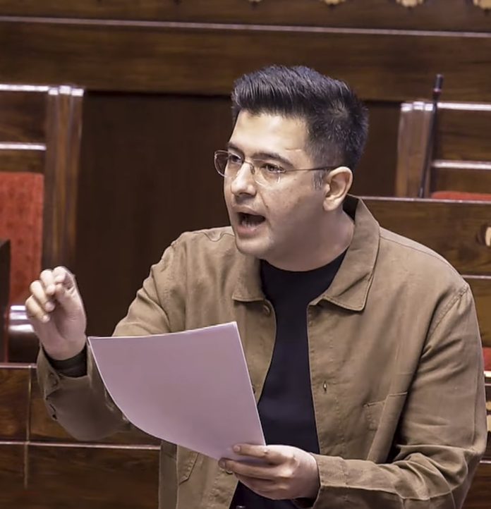 **EDS: THIRD PARTY IMAGE; SCREENGRAB VIA SANSAD TV** New Delhi: AAP MP Raghav Chadha speaks in the Rajya Sabha during the second part of Budget session of Parliament, in New Delhi, Wednesday, March 11, 2026. (Sansad TV via PTI Photo)(PTI03_11_2026_000076B)