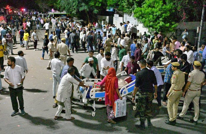 Jaipur: Patients, hospital staff and others gather after a fire broke out at the trauma centre of the state-run Sawai Man Singh (SMS) Hospital, late Sunday night, in Jaipur, Monday, Oct. 6, 2025. Six patients died in the incident. (PTI Photo)(PTI10_06_2025_000010B)