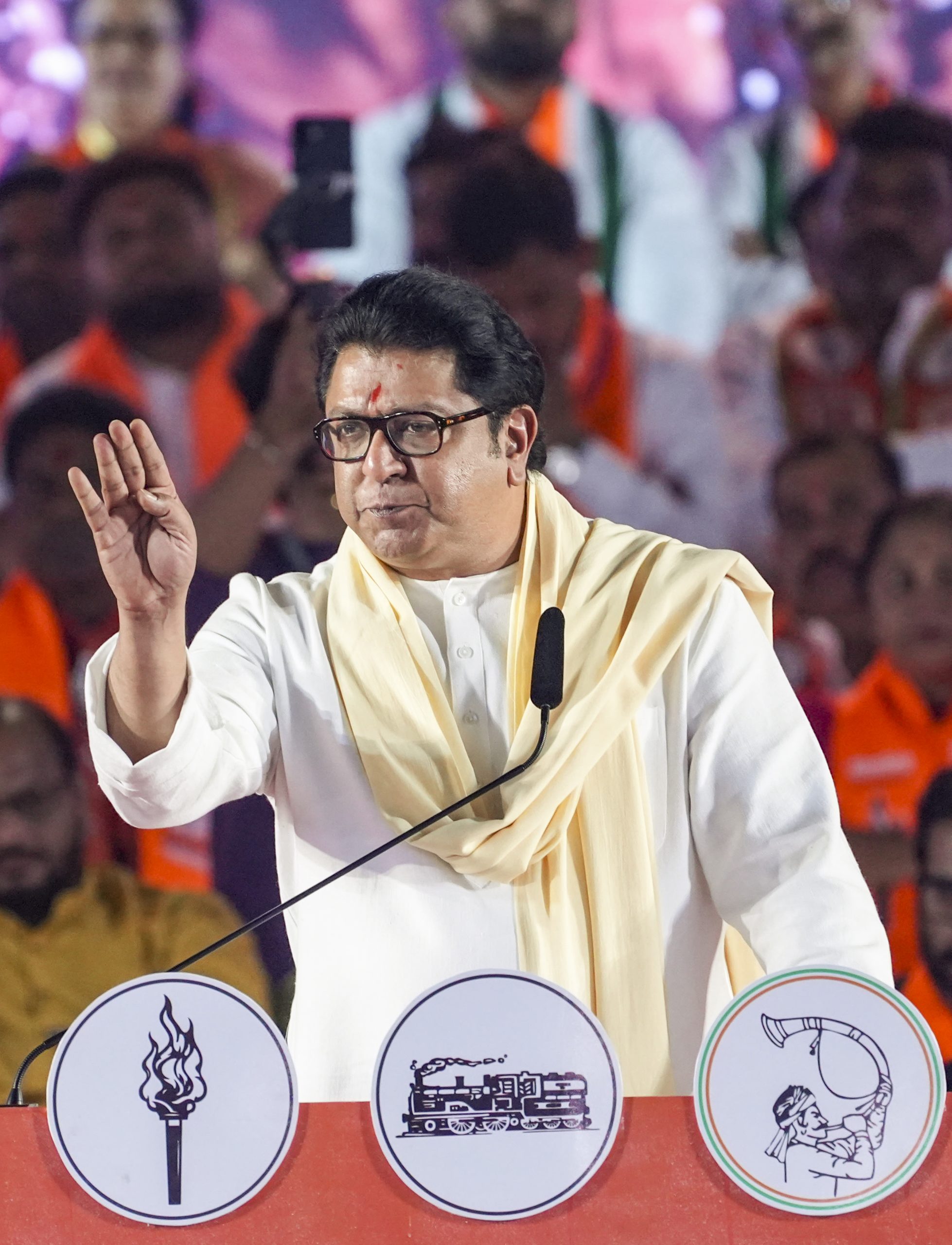 Mumbai: Maharashtra Navnirman Sena (MNS) chief Raj Thackeray addresses a Shiv Sena (UBT)-MNS joint rally ahead of the Brihanmumbai Municipal Corporation (BMC) election, in Mumbai, Friday, Jan. 11, 2026. (PTI Photo/Shashank Parade) (PTI01_11_2026_000767B)