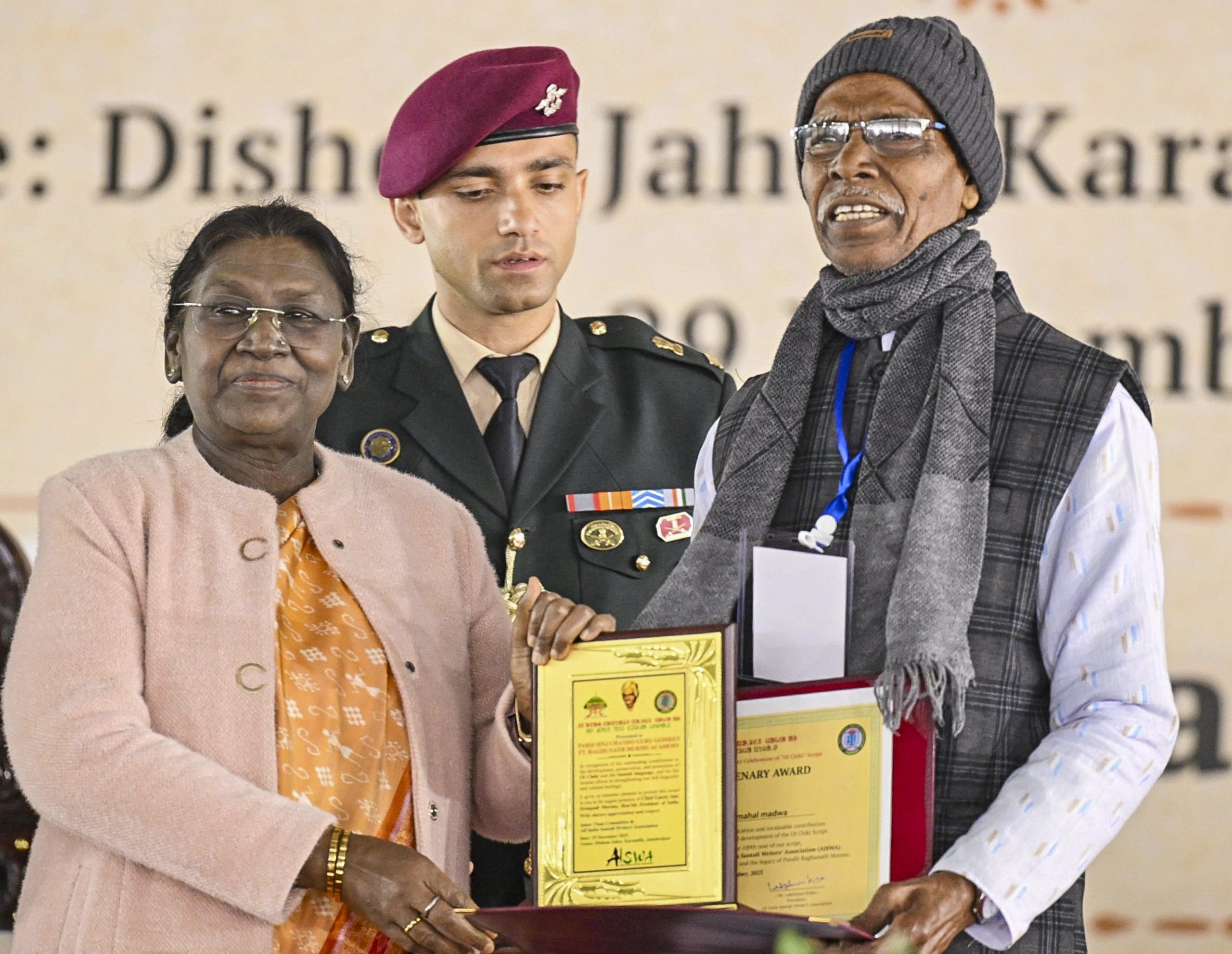 **EDS: THIRD PARTY IMAGE** In this image received on Dec. 29, 2025, President Droupadi Murmu during the 22nd Parsi Maha and centenary celebrations of Ol Chiki, in Jamshedpur. (Rashtrapati Bhavan via PTI Photo)(PTI12_29_2025_000134B) *** Local Caption ***