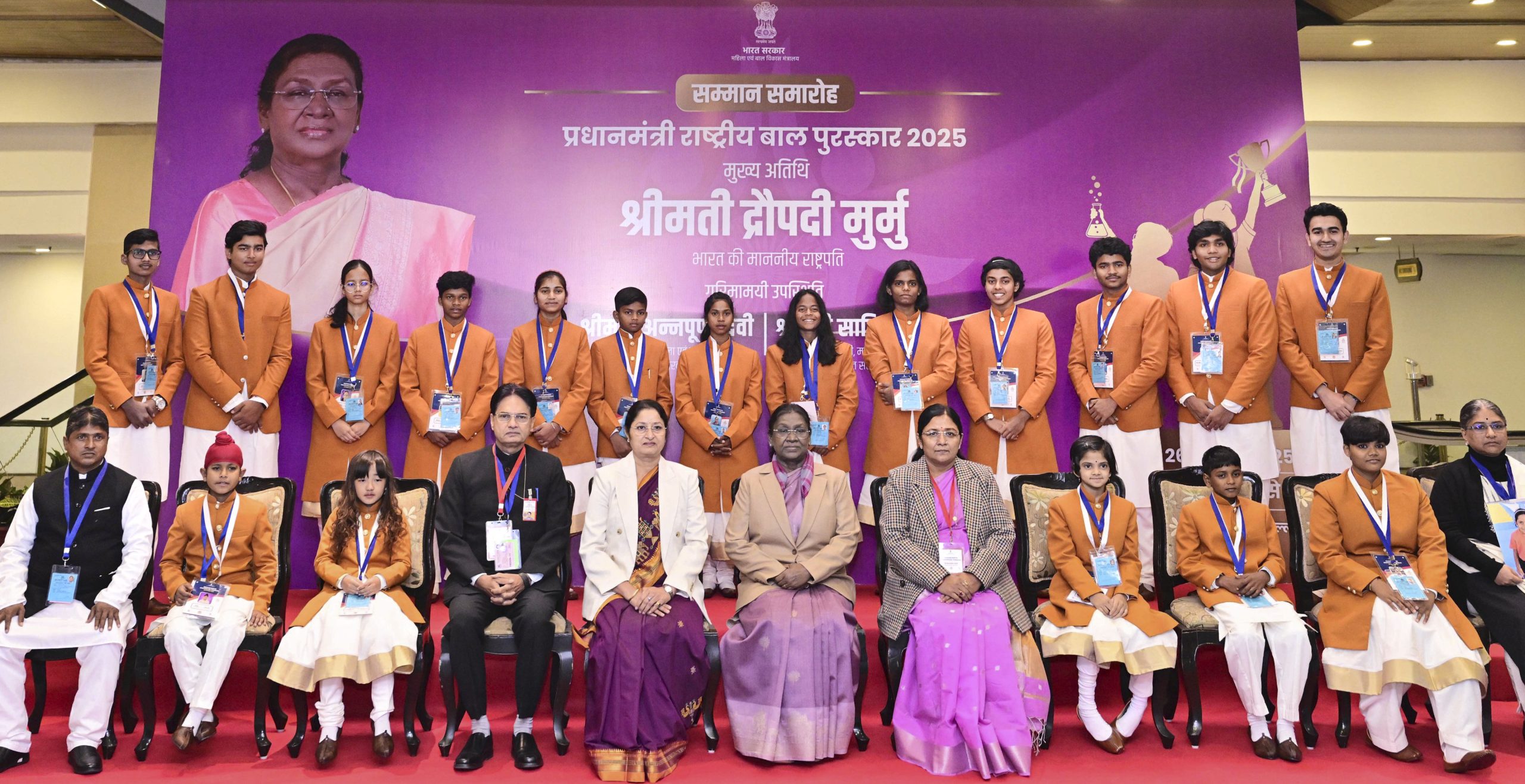 नई दिल्ली, 26 दिसंबर (पीटीआई) — राष्ट्रपति द्रौपदी मुर्मू ने शुक्रवार को नई दिल्ली में आयोजित एक समारोह में बहादुरी, सामाजिक सेवा, पर्यावरण, खेल, कला एवं संस्कृति तथा विज्ञान एवं प्रौद्योगिकी के क्षेत्र में असाधारण उपलब्धियों के लिए 20 बच्चों को प्रधानमंत्री राष्ट्रीय बाल पुरस्कार प्रदान किए।