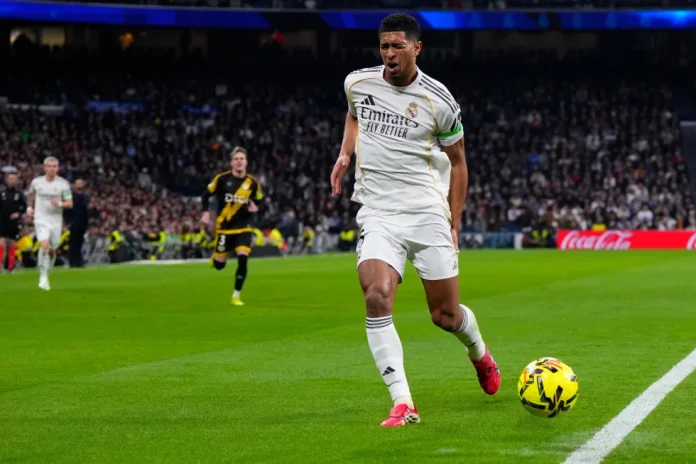 Real Madrid’s Jude Bellingham reacts in pain during the Spanish La Liga soccer match between Real Madrid and Rayo Vallecano in Madrid, Spain, Sunday, Feb. 1, 2026. (AP Photo/Manu Fernandez)