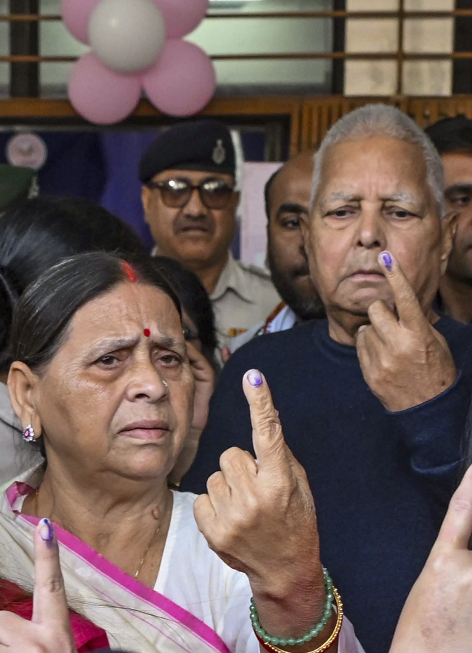 Patna: RJD leaders and former Bihar chief ministers Lalu Prasad Yadav and Rabri Devi show their fingers marked with indelible ink after casting votes at a polling station during the first phase of Bihar Assembly elections, in Patna, Thursday, Nov. 6, 2025. (PTI Photo) (PTI11_06_2025_000025B)