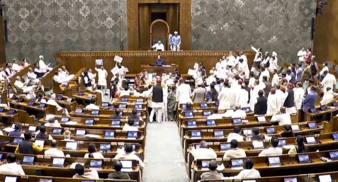 **EDS: THIRD PARTY IMAGE; SCREENGRAB VIA SANSAD TV** New Delhi: Opposition protest in Lok Sabha demanding discusssion on West Asia crisis during the second part of Budget session of Parliament, in New Delhi, Monday, March 9, 2026. (Sansad TV via PTI Photo)(PTI03_09_2026_000248B)