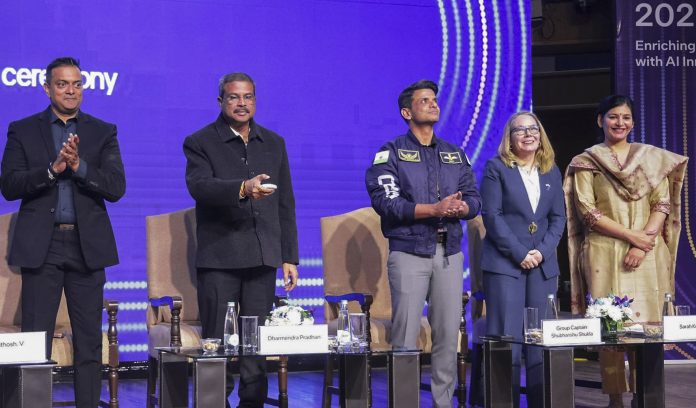 **EDS: THIRD PARTY IMAGE** In this image posted on Nov. 17, 2025, Union Education Minister Dharmendra Pradhan with Indian astronaut and fighter pilot Shubhanshu Shukla and other dignitaries during the launch of AI initiatives at the AI Impact Festival 2025, in New Delhi. (@dpradhanbjp/X via PTI Photo)(PTI11_17_2025_000397B)