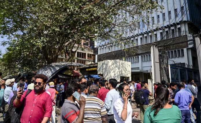 Kolkata: People gather outside Metro Rail Bhavan building as tremors were felt in the city and adjacent districts of West Bengal, in Kolkata, Friday, Feb. 27, 2026. An earthquake of 5.5 magnitude on the Richter Scale jolted parts of Bangladesh, officials said. (PTI Photo)(PTI02_27_2026_000140B)