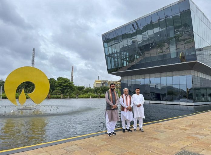 **EDS: THIRD PARTY IMAGE** In this image posted by @mlkhattar on X on June 5, 2025, Union Minister of Power Manohar Lal along with Haryana Chief Minister Nayab Singh Saini and state cabinet minister Rao Narbir Singh visits Reliance Industries' Jamnagar Refinery, in Gujarat. (@mlkhattar via PTI Photo)(PTI07_05_2025_000401B)