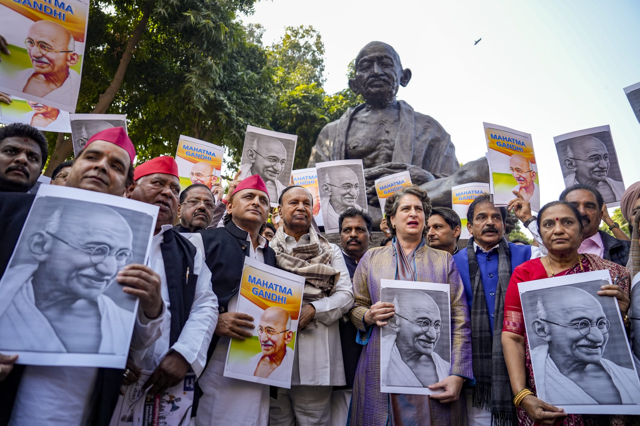 नई दिल्ली, 18 दिसंबर (PTI) — हाथ में महात्मा गांधी की तस्वीरें लेकर कई विपक्षी सांसदों ने गुरुवार को संसद भवन परिसर के अंदर सरकार के G RAM G बिल के खिलाफ विरोध मार्च निकाला और इसके वापस लेने की मांग की।