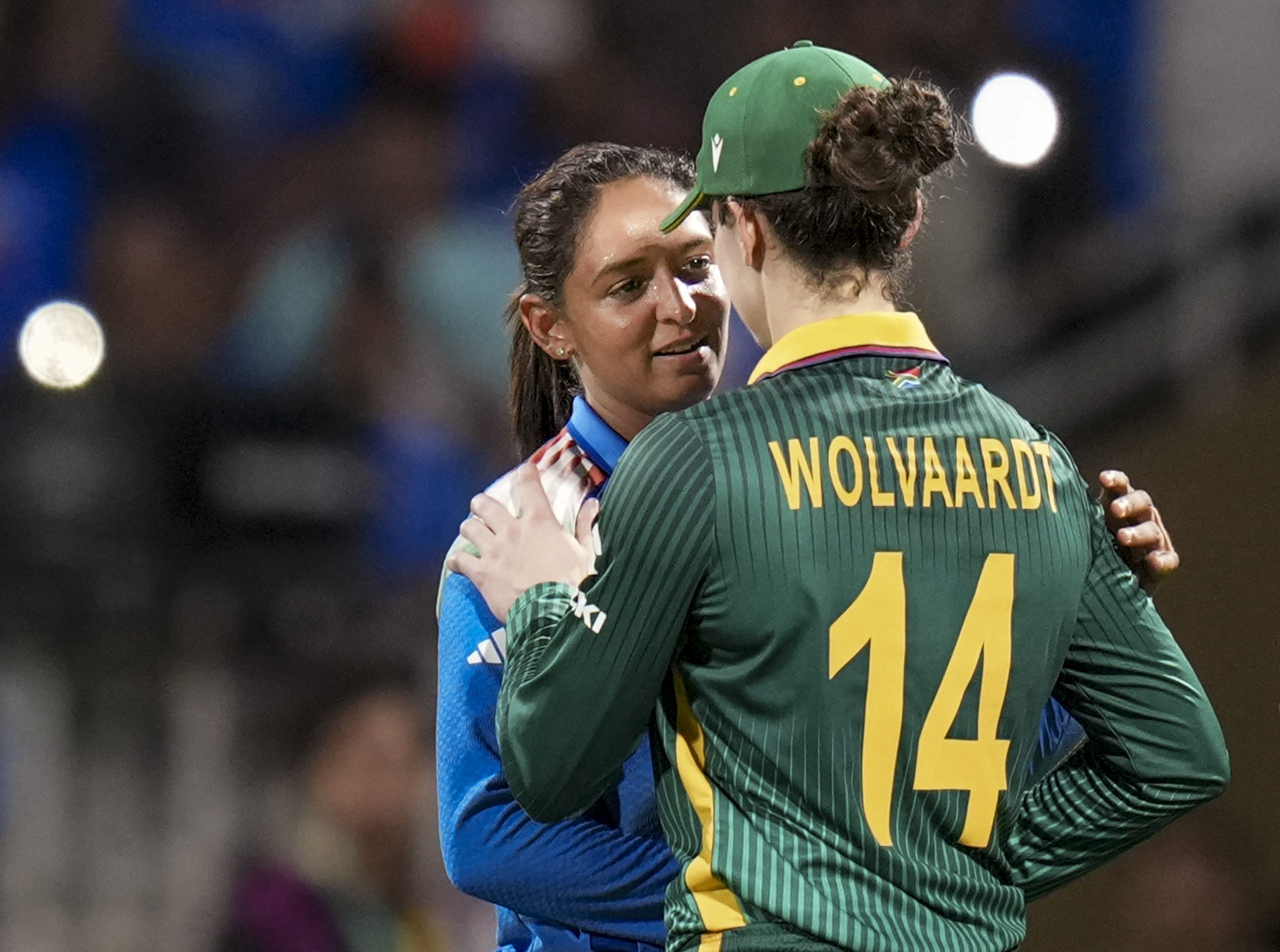 **EDS, YEARENDERS 2025: WOMEN IN SPORTS** Navi Mumbai: India’s captain Harmanpreet Kaur, left, being congratulated by South Africa’s captain Laura Wolvaardt after winning the ICC Women's World Cup final ODI cricket match between India Women and South Africa Women, at the DY Patil Stadium, in Navi Mumbai, Sunday, Nov. 2, 2025. (PTI Photo/Kunal Patil) (PTI11_03_2025_000036B)(PTI12_25_2025_000116B)