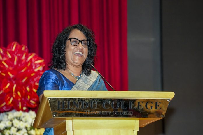 New Delhi: Sri Lanka Prime Minister Harini Amarasuriya addresses the gathering during her visit to the Hindu College, in New Delhi, Thursday, Oct. 16, 2025. (PTI Photo/Kamal Kishore)(PTI10_16_2025_000068B)