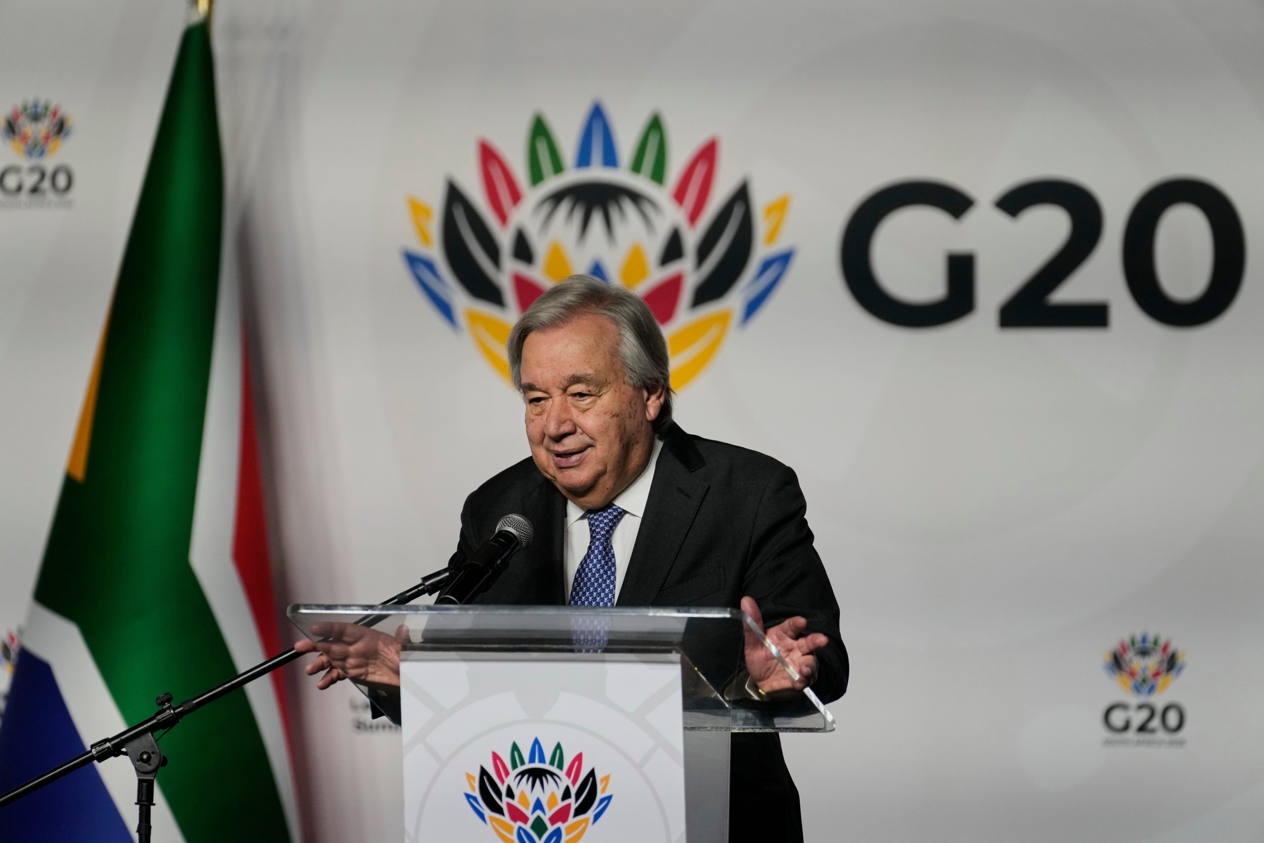 United Nations Secretary-General António Guterres addresses a media conference on the eve of the G20 Summit in Johannesburg, South Africa, Friday, Nov. 21, 2025. AP/PTI(AP11_21_2025_000360B)