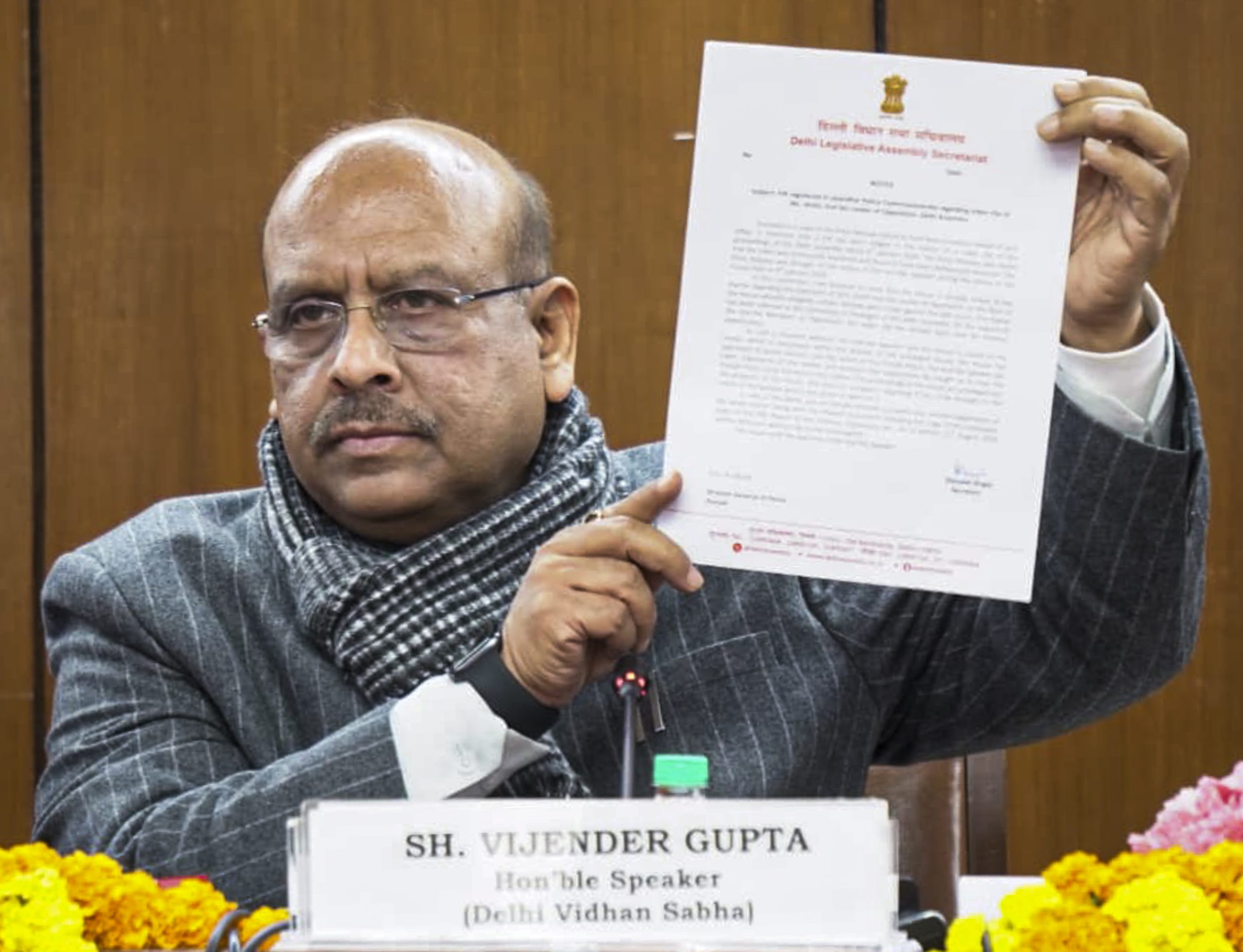 New Delhi: Delhi Assembly Speaker Vijender Gupta addresses a press conference regarding notices issued to Punjab Police officials over an FIR using Assembly video footage, in New Delhi, Saturday, Jan. 10, 2026. (PTI Photo)(PTI01_10_2026_000151B)