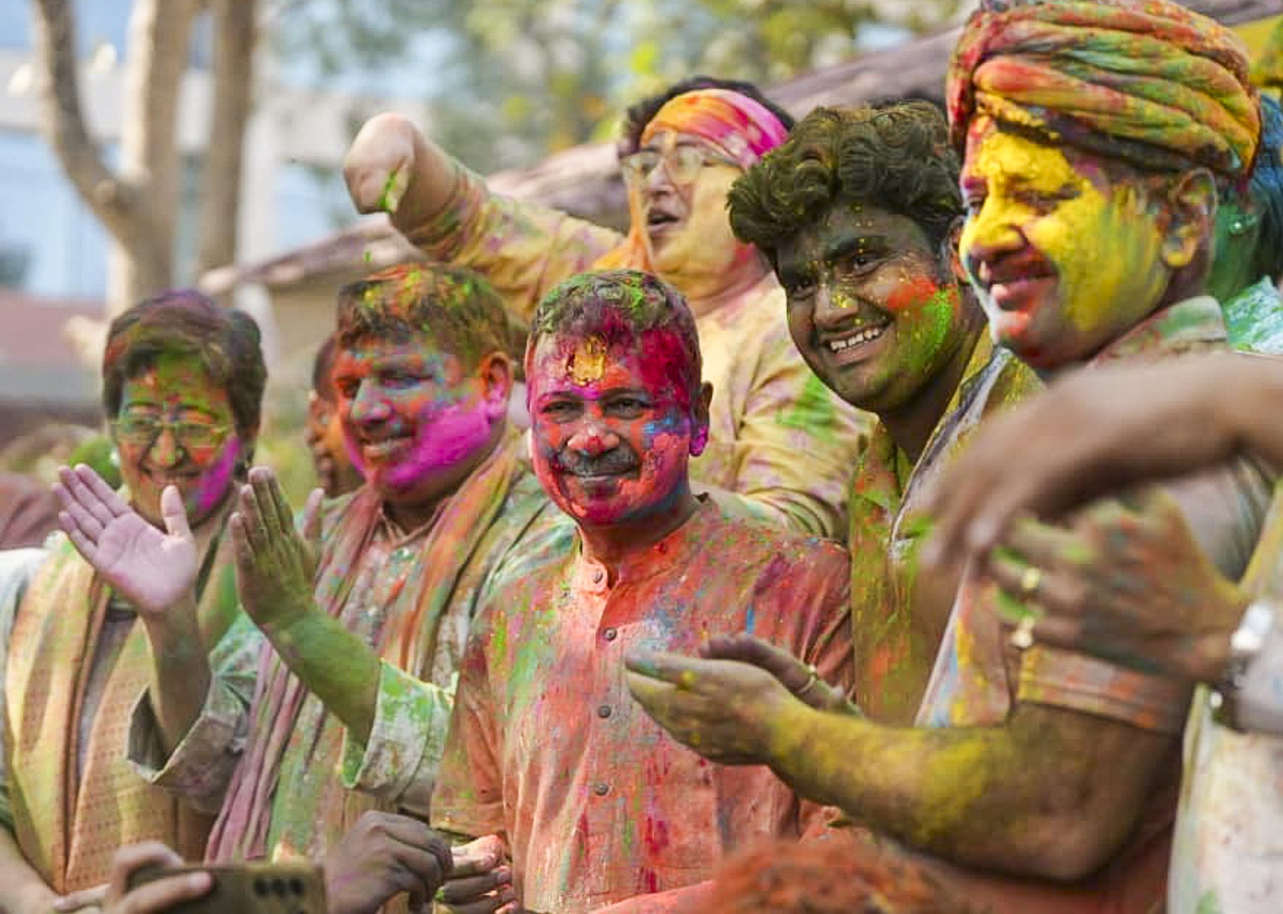 **EDS: THIRD PARTY IMAGE** In this image posted on March 4, 2026, Aam Aadmi Party (AAP) chief Arvind Kejriwal and party leaders Atishi, Sanjay Singh and Manish Sisodia and others celebrate the Holi festival at the latter's residence, in New Delhi. (@AamAadmiParty/X via PTI Photo) (PTI03_04_2026_000069B) *** Local Caption ***