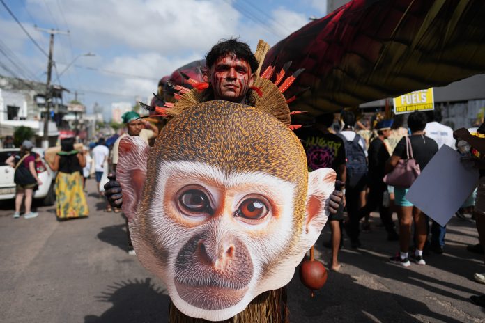 An Indigenous activist carries an image of a monkey at a climate protest during the COP30 U.N. Climate Summit, Monday, Nov. 17, 2025, in Belem, Brazil.AP/PTI(AP11_17_2025_000340B)
