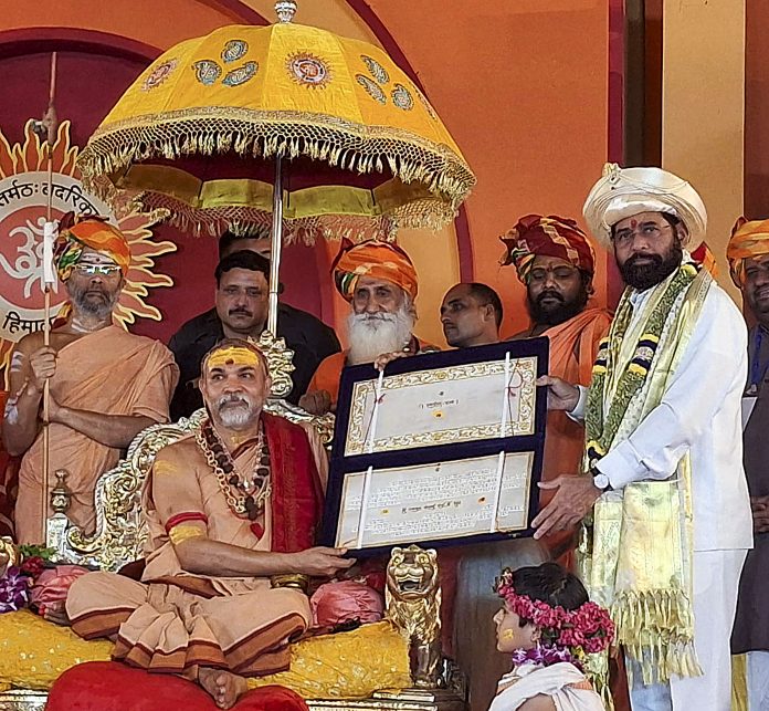 Mumbai: Jagadguru Shankaracharya Swami Avimukteshwaranand Saraswati Maharaj felicitated Maharashtra Deputy CM Eknath Shinde at an event, in Mumbai, Tuesday, Aug. 26, 2025. (PTI Photo)(PTI08_26_2025_000533B)