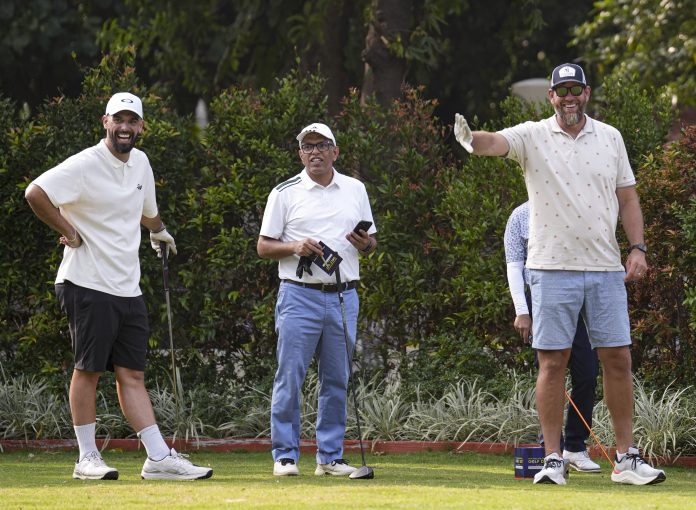 Mumbai: New Zealand's cricketer Daryl Mitchell, left, and former cricketer Jacob Oram, right, during the New Zealand Cricket Team's Golf Day, at Willingdon Sports Club, in Mumbai, Tuesday, Jan. 6, 2026.(PTI Photo/Kunal Patil)(PTI01_06_2026_000226B)