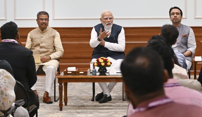 **EDS: THIRD PARTY IMAGE** In this image received on Sept. 4, 2025, Prime Minister Narendra Modi with Union Education Minister Dharmendra Pradhan and Minister of State Jayant Chaudhary during a meeting with winners of National Teachers Awards, 2025, at his official residence, in New Delhi. (PMO via PTI Photo) (PTI09_04_2025_000402B)