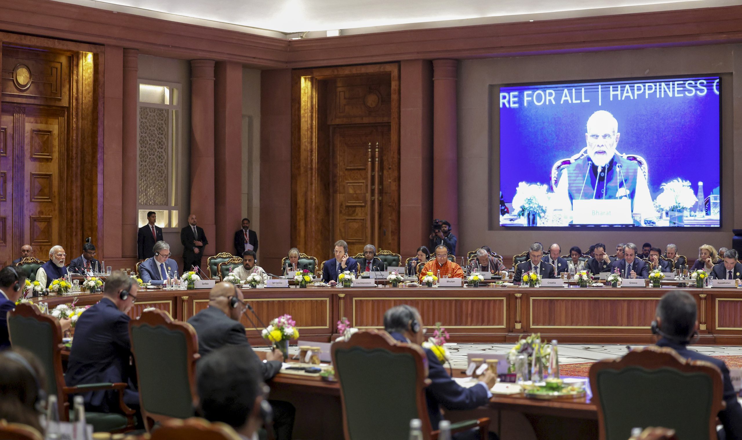 ভারত মণ্ডপমের অডিটোরিয়ামে প্রধানমন্ত্রীর পেছনে একটি বড় পর্দায় এআই-সক্ষম সাইন ল্যাঙ্গুয়েজ ব্যাখ্যা প্রদর্শিত হয়, যাতে ভাষণটি সবার জন্য সহজলভ্য হয়।