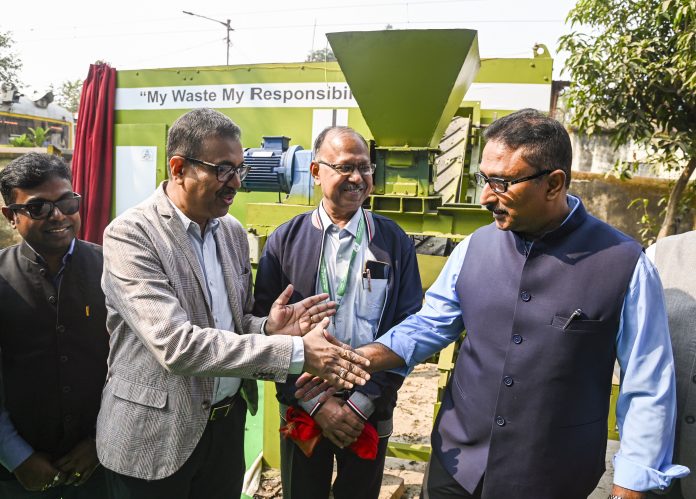 Kolkata: Syama Prasad Mookerjee Port Chairman Rathendra Raman, right, greets Evergreen Future CEO Debashis Bose, second left, during the launch of an Ecogenik waste-to-solid fuel machine, near Armenian Ghat, in Kolkata, Tuesday, Dec. 16, 2025. (PTI Photo)(PTI12_16_2025_000391B)