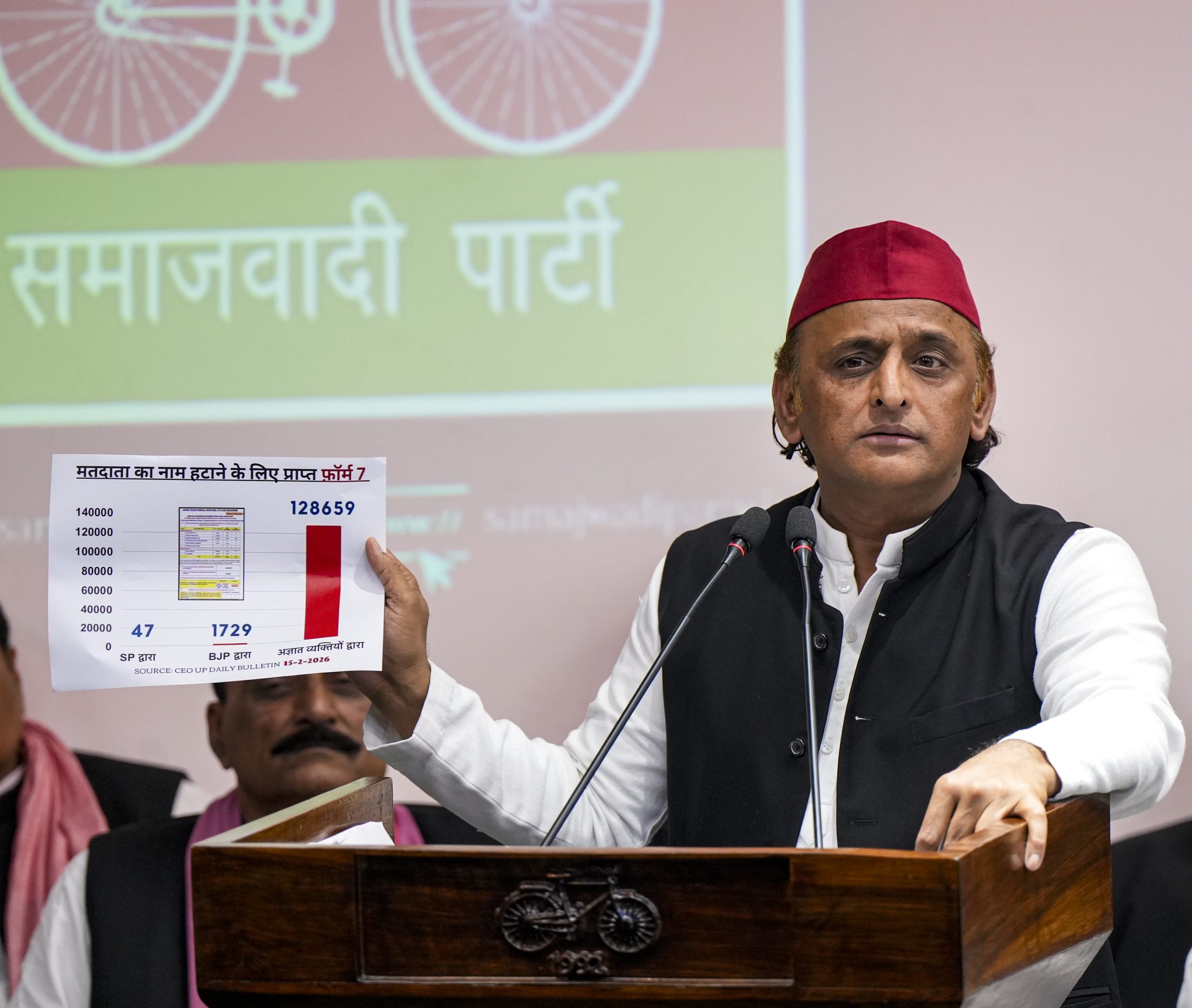 Lucknow: Samajwadi Party President Akhilesh Yadav addresses a press conference, at party office in Lucknow, Monday, Feb. 16, 2026. (PTI Photo/Nand Kumar)(PTI02_16_2026_000298B)