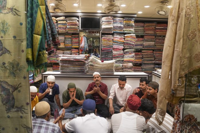 Kolkata: People offer prayers before breaking their fast during iftar in the holy month of Ramzan at a garment shop ahead of Eid al-Fitr, in Kolkata, Thursday, March 19, 2026. (PTI Photo/Swapan Mahapatra)(PTI03_19_2026_000255B)