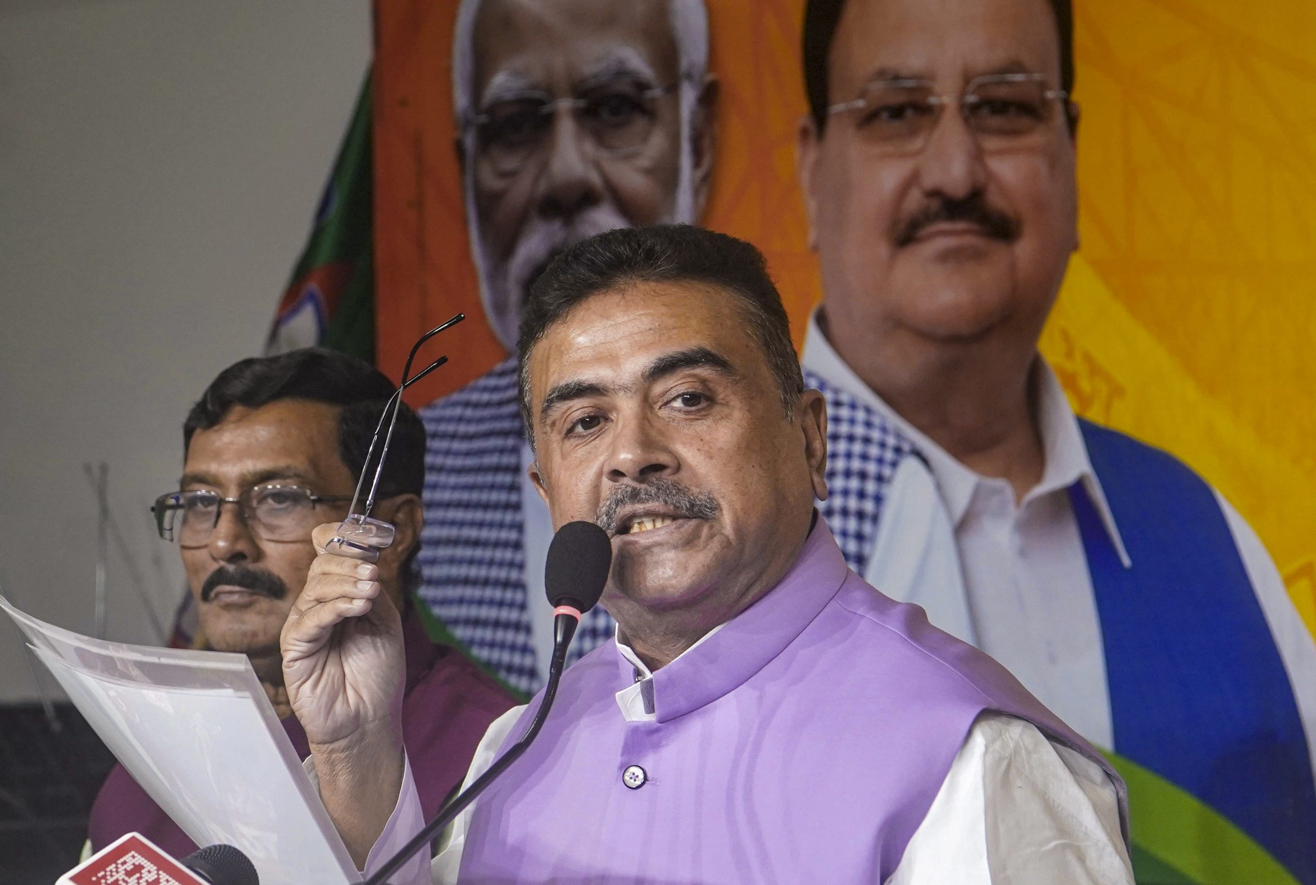 Kolkata: LoP in the West Bengal Assembly and BJP leader Suvendu Adhikari addresses a press conference, in Kolkata, Monday, Dec. 8, 2025. (PTI Photo)(PTI12_08_2025_000404B)