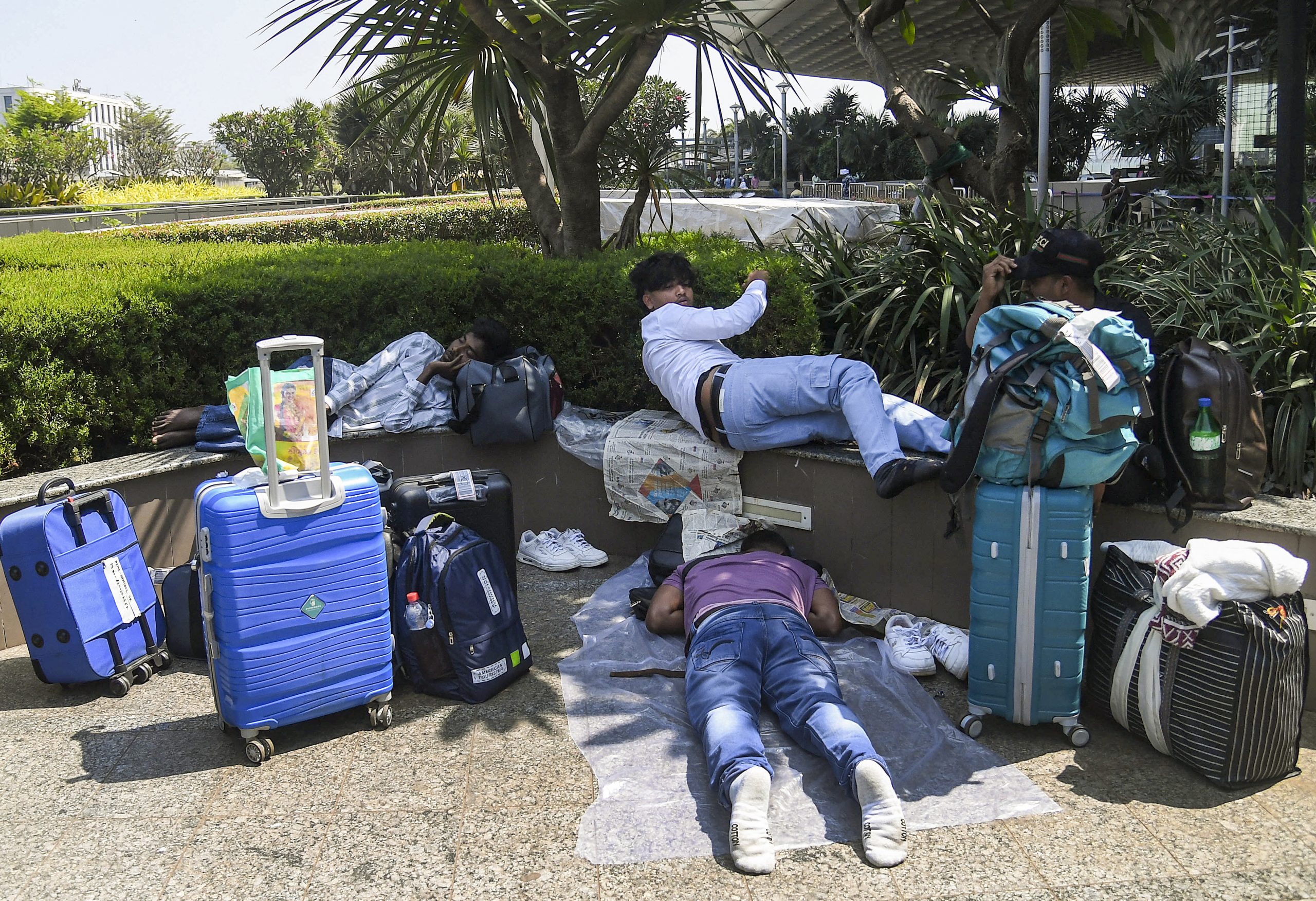 Mumbai: Passengers wait at Chhatrapati Shivaji Maharaj International Airport after flights to Middle East countries were delayed amid the ongoing Iran-Israel conflict, in Mumbai, Sunday, Mar. 1, 2026. (PTI Photo)(PTI03_01_2026_000250B)