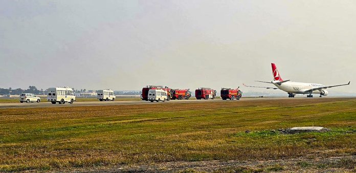 **EDS: THIRD PARTY IMAGE** Kolkata: The Turkish Airlines plane, right, that made an emergency landing after the pilot declared a fire in the aircraft's right engine, at Kolkata airport, Wednesday, Feb. 4, 2026. The flight was bound for Istanbul from Kathmandu, according to the Ministry of Civil Aviation. (MoCA via PTI Photo)(PTI02_04_2026_000321B)