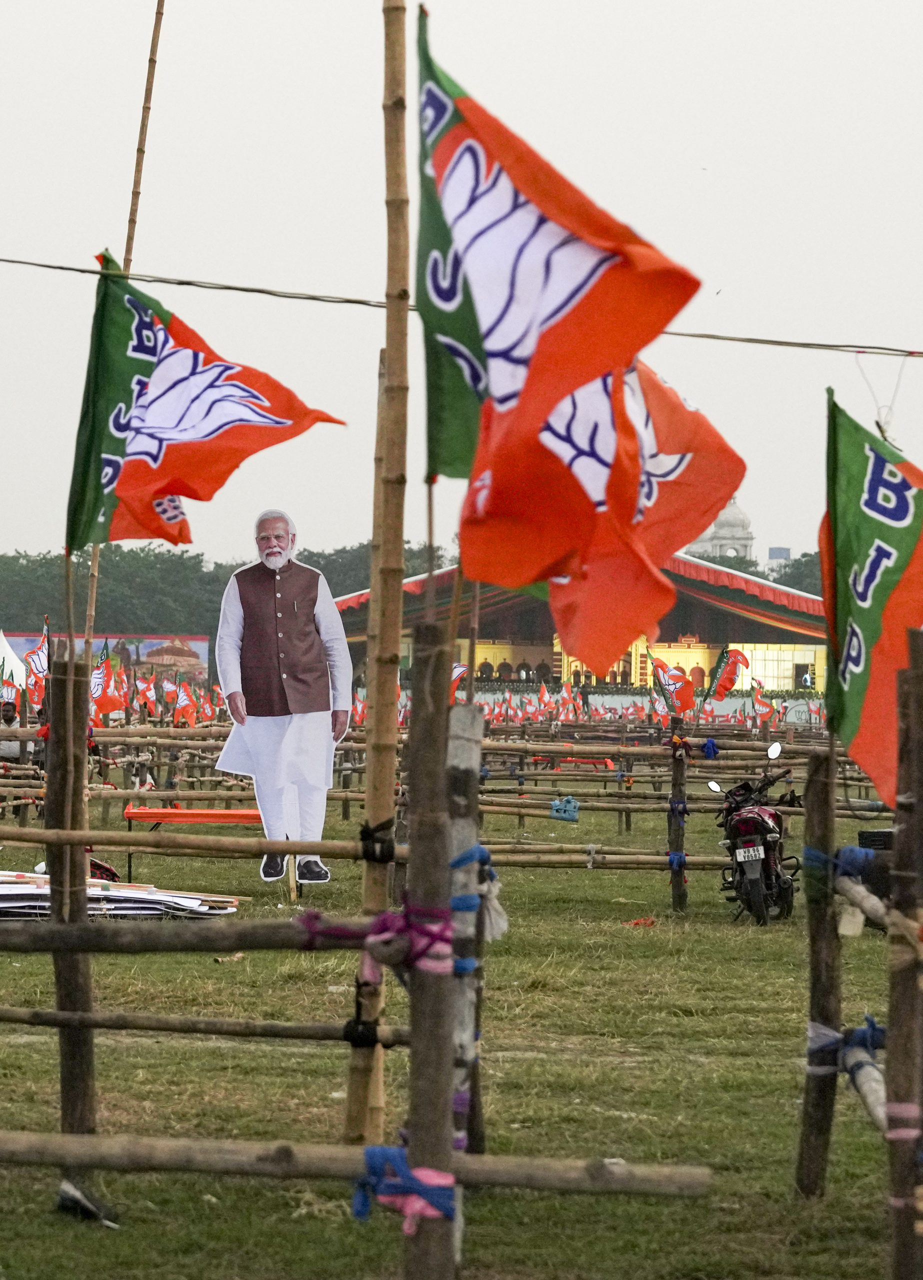 মঞ্চের সামনে ‘পল্টানো দরকার, চাই বিজেপি সরকার “স্লোগান সম্বলিত একটি বিশাল কাটআউট রাখা হয়েছে।