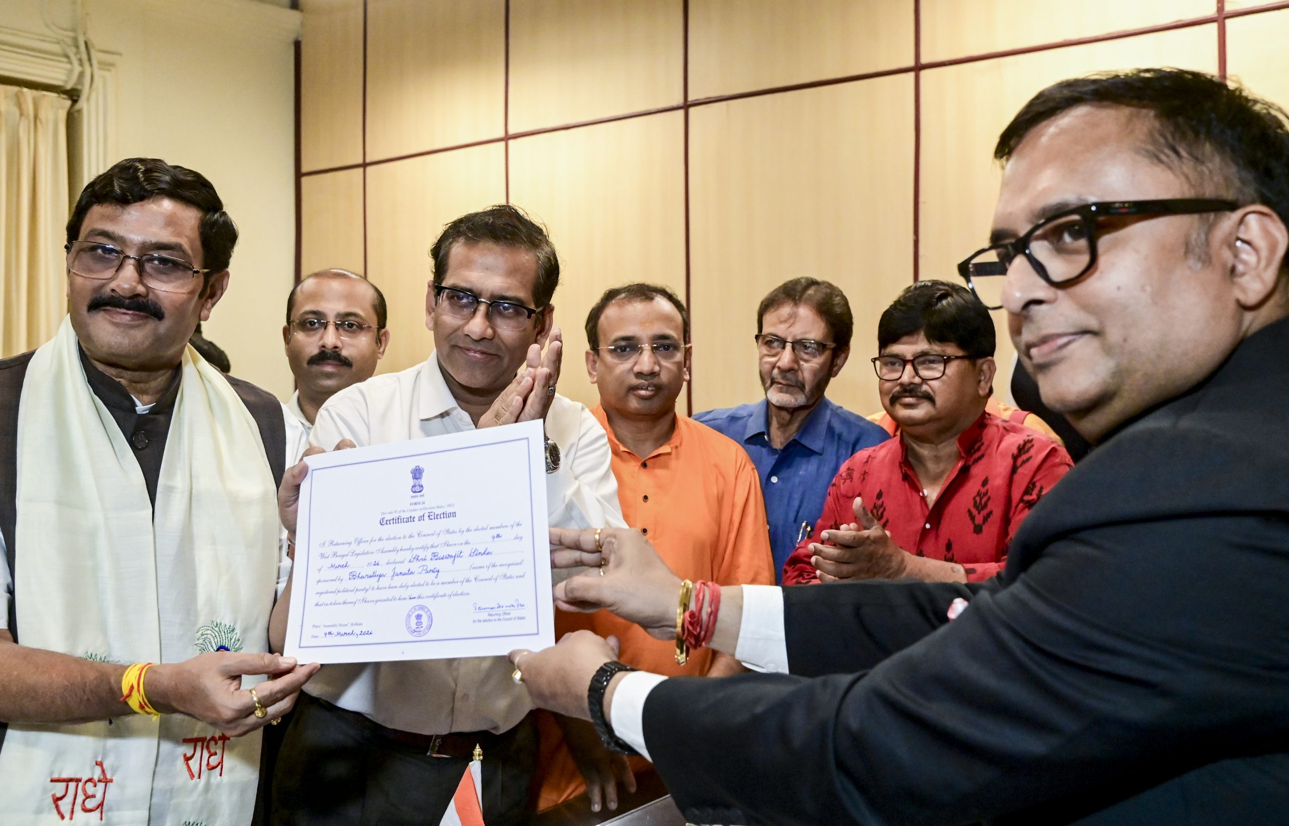 Kolkata: Former BJP West Bengal President Rahul Sinha, left, receives the certificate of election for the Rajya Sabha polls, in Kolkata, Monday, March 9, 2026. (PTI Photo) (PTI03_09_2026_000361B)