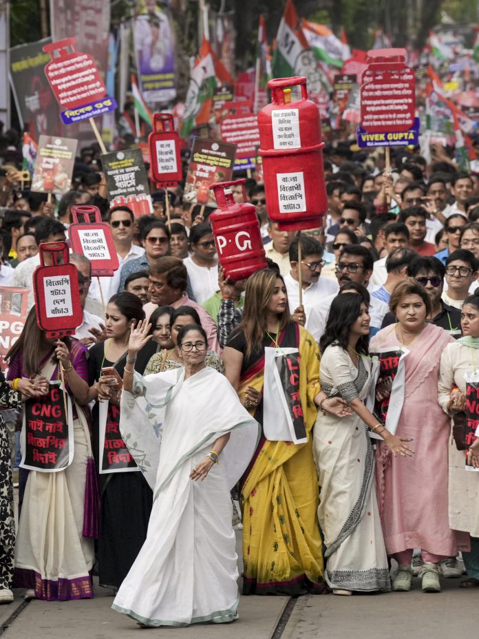Kolkata: TMC supremo and West Bengal Chief Minister Mamata Banerjee with party leaders and activists during a rally protesting against the LPG price hike and supply crisis, in Kolkata, Monday, March 16, 2026. (PTI Photo/Swapan Mahapatra)(PTI03_16_2026_000292B)