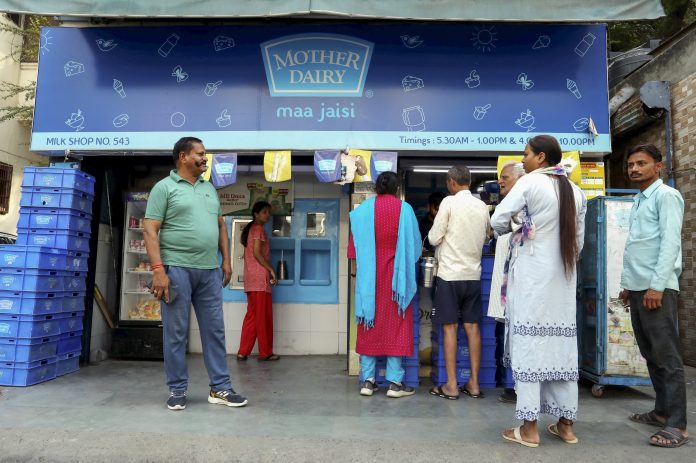 New Delhi: People outside a Mother Dairy booth, in New Delhi, Wednesday, April 30, 2025. Mother Dairy has hiked milk prices by up to Rs 2 per litre effective Wednesday to partly offset rising input costs. (PTI Photo) (PTI04_30_2025_000034B)